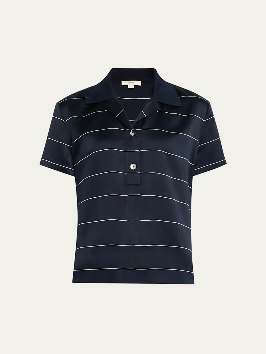 Vince striped silk polo shirt finished with a knit collar Short sleeves Relaxed fit Hem falls to the hip Button-placket Silk/viscose/nylon/polyamide Dry clean or hand wash Imported Online Inquiries: BGS21_T8ZRF| Store Inquiries: #5034993