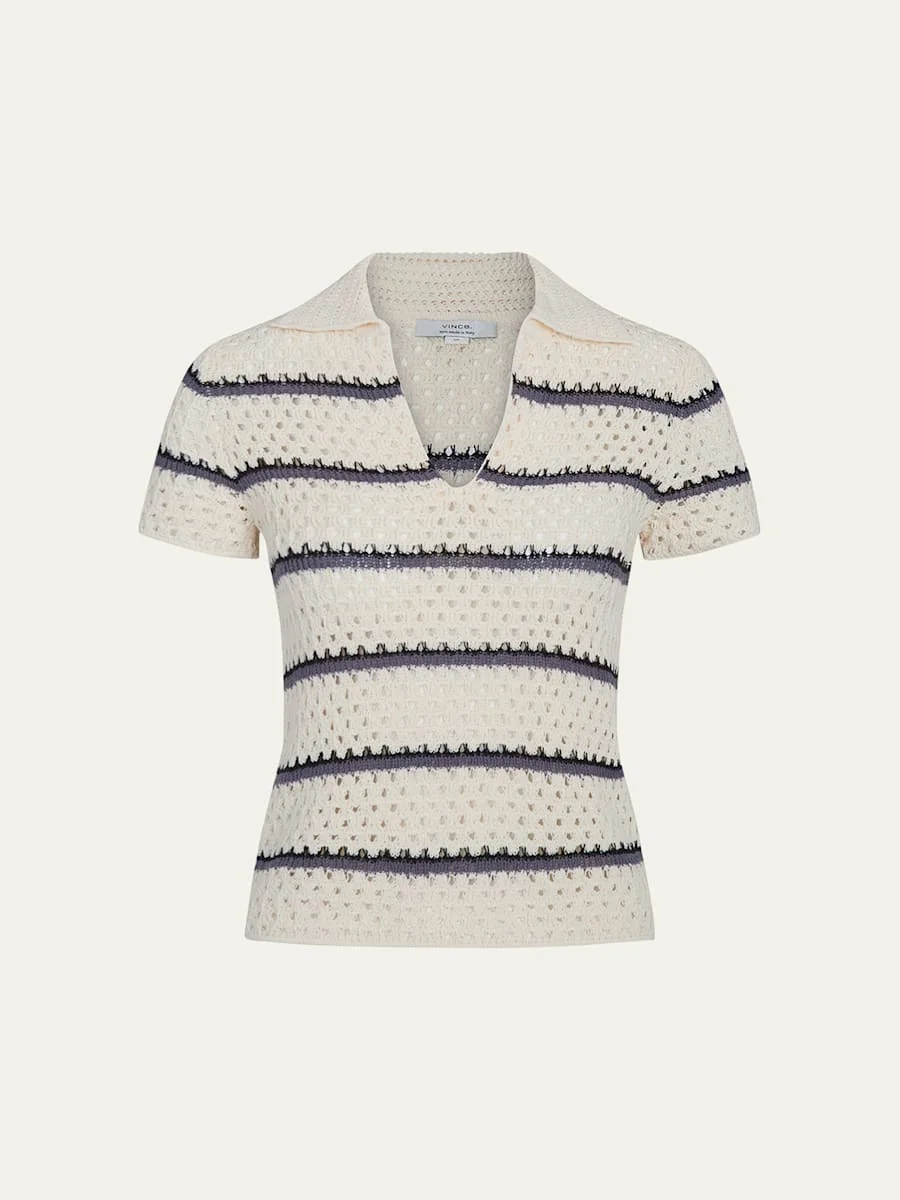 Vince striped macrame top Point collar; V neckline Short sleeves Easy fit Hem sits at the hip Pullover style Cotton Hand wash cold or dry clean Imported Online Inquiries: BGS21_T6L30| Store Inquiries: #5001043