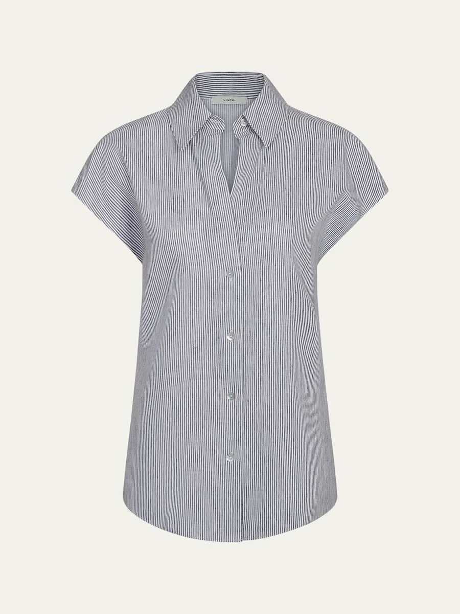 Vince ticking striped blouse Point collar Cap sleeves Relaxed fit Rounded hem Button-front Linen/cotton Dry clean or machine wash cold Imported Online Inquiries: BGS21_T6L34| Store Inquiries: #5001047