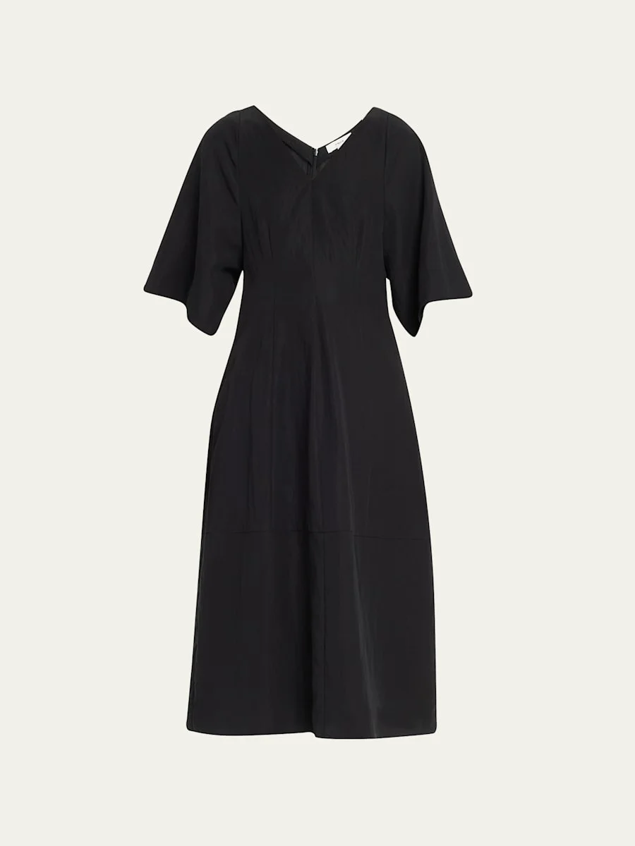 Vince dress tailored with darts throughout V neckline; V'd back Short flutter sleeves Side seam pockets Fit-&-flare silhouette Full length Invisible back zipper Lyocell/nylon Imported Model is 5'10"/177cm. Online Inquiries: BGS21_T4C3D| Store Inquiries: #4461376