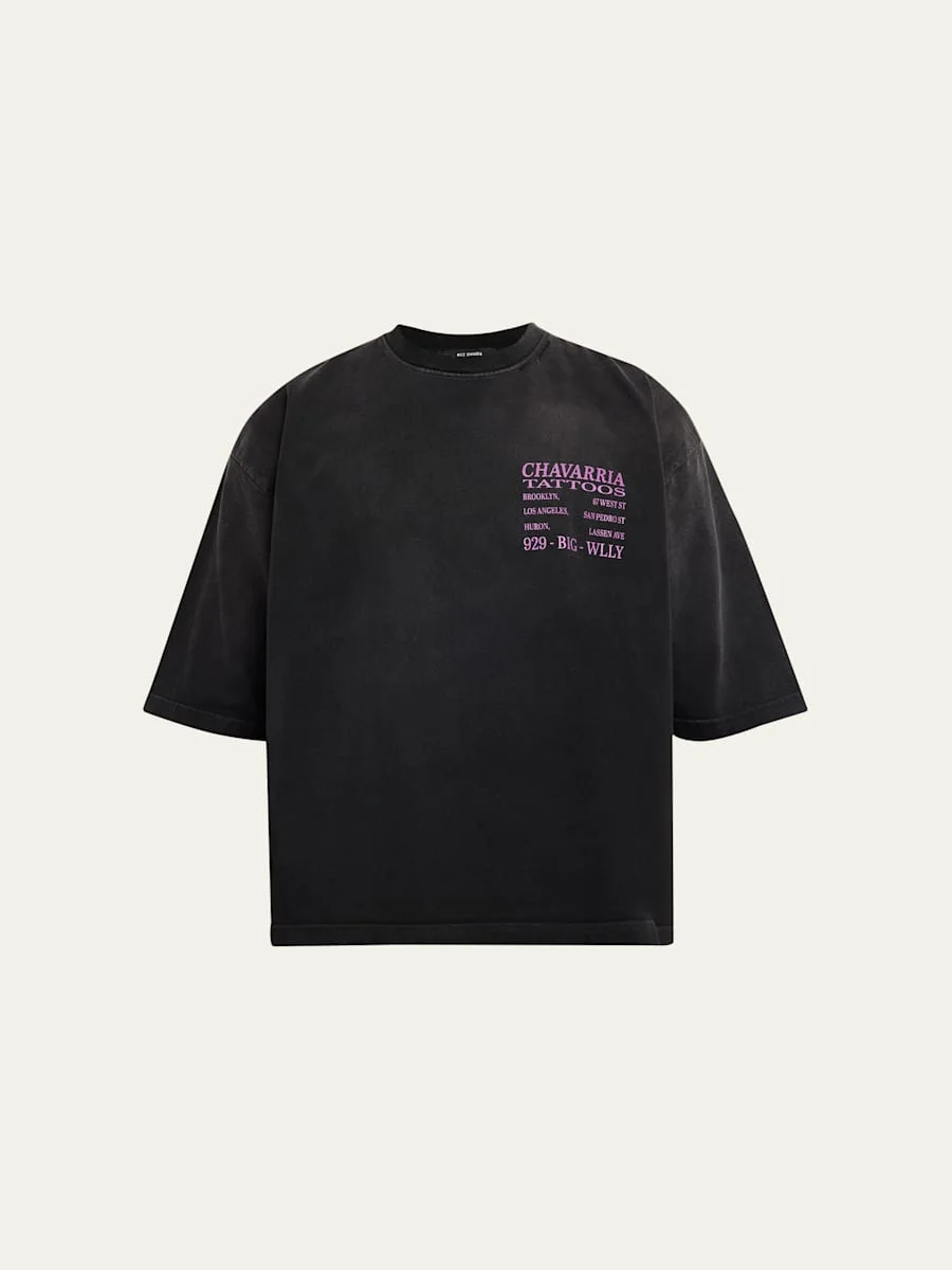 An everyday staple with a boxy fit, this Tshirt by Willy Chavarria is crafted from cotton with the "Chavarria Tattoos" motif on the chest and back. Slight distressing Crewneck Boxy fit Cotton Machine wash cold, tumble dry Made in USA