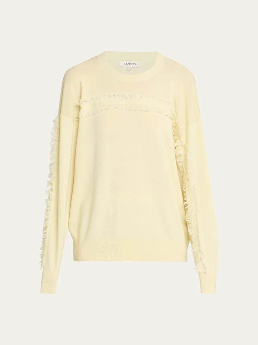 Crafted from wool knit, this sweater from ZANKOV features eyelash fringed trim along the chest and sleeves Crew neckline Long sleeves Dorp shoudlers Loose fit Hip length Ribbed cuffs and hem Wool Dry clean Imported SIZE amp; FITModel measurements: 5'10" tall Model is wearing a US size 4/Small