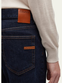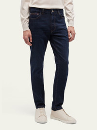 ZEGNA jeans in dark wash denim fabric with classic five-pocket style Button-zip front; belt loops Regular rise; flat front Logo patch at back Signifier stripe accent at back pocket Slim, straight legs Full length Classic fit Cotton Imported Model is 6'1"/185cm. Online Inquiries: BGS21_N9TKJ| Store Inquiries: #4381143