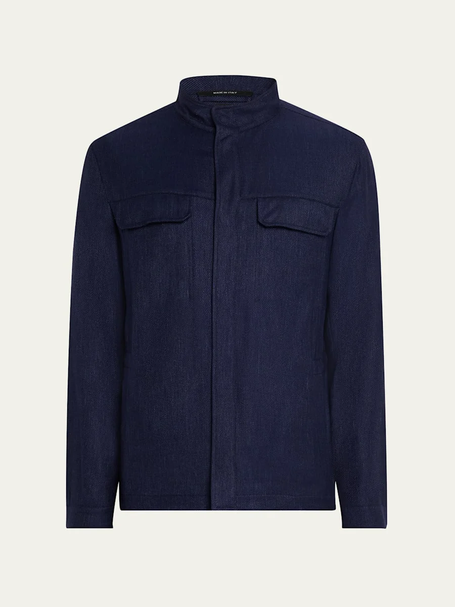 ZEGNA blouson jacket in luxuriously soft twill Stand collar Concealed snap placket Two chest flap pockets Internal drawstring Long sleeves with snap cuffs Yoked back shoulders Cashmere/silk/linen Dry clean Made in Italy Proposition 65 warning for California residents Online Inquiries: BGS21_NCH58| Store Inquiries: #4883593