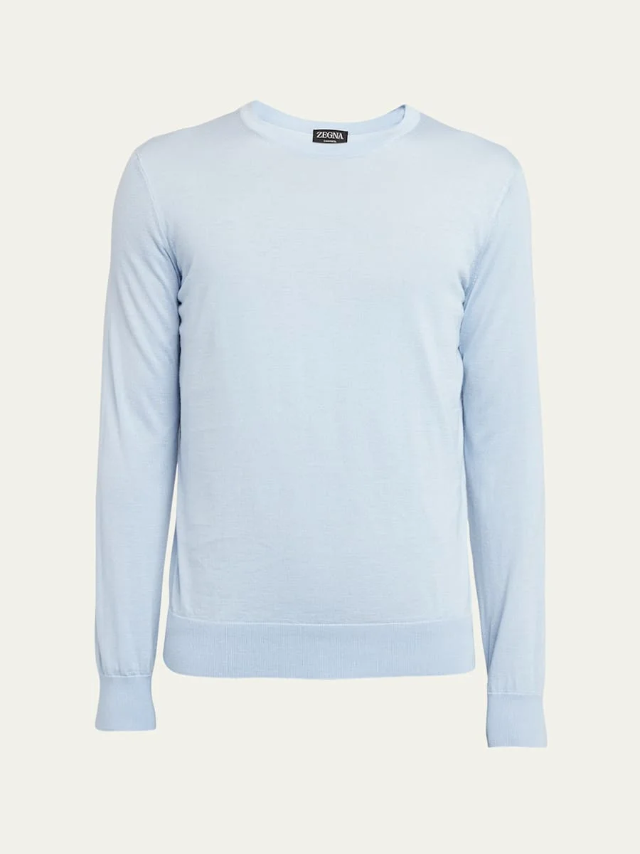 ZEGNA sweater in solid Cashseta fabric Cashseta is an exclusive fabric made from ultra-fine yarn obtained from a blend of precious cashmere, collected from select Mongolian goats, and lustrous silk Crew neckline Long sleeves Ribbed cuffs and hem Pullover style Cashmere/silk Dry clean Made in Italy Model is 6'1"/185cm. Online Inquiries: BGS21_NCCMU| Store Inquiries: #4854022