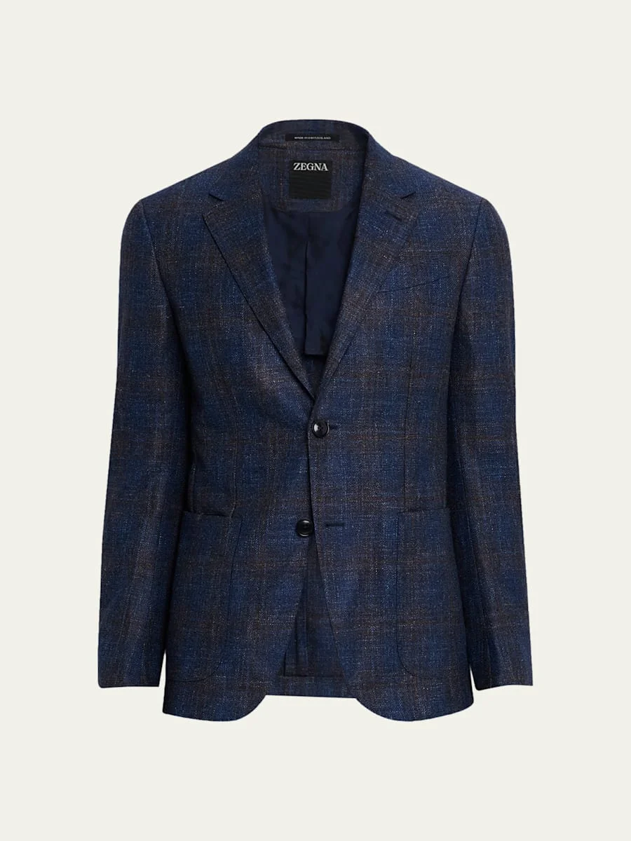 ZEGNA subtle check sport coat in wool, silk and linen resulting in a dimensional textured finish Notched lapels Barchetta chest pocket Hip patch pockets Internal breast pocket Long sleeves Doublevented back Wool/silk/linen Unlined Dry clean Made in Italy