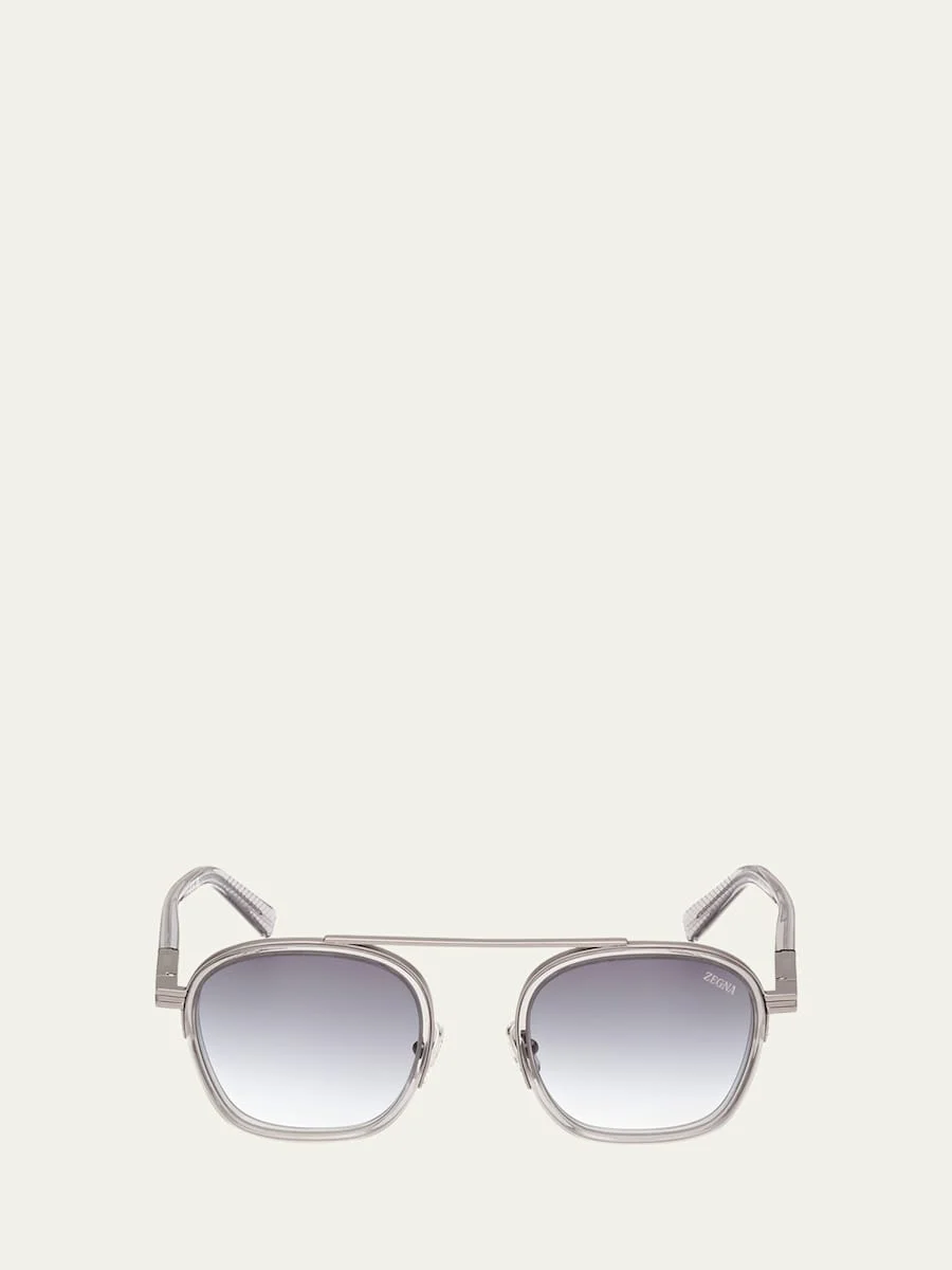 ZEGNA round sunglasses with metal frames Lens/bridge/temple (in mm): 55-21-145 Gradient lenses Left lens logo script Metal top bar Adjustable nose pads Temples with logo lettering Thin arms with exposed metal corewire Metal Spot clean 100% UVA/UVB protection Made in Italy Proposition 65 warning for California residents Online Inquiries: BGS21_NBMMD| Store Inquiries: #4673026