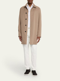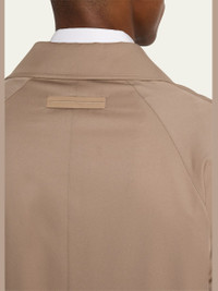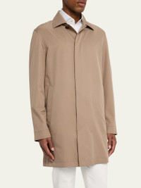 ZEGNA microfiber raincoat with wool back lining for added comfort Leather Signifier stripe on the back neck Spread collar Concealed button front Side slant pockets Long sleeves Single-button cuffs Long length Polyester/wool/leather Dry clean Made in Italy Online Inquiries: BGS21_NCMZN| Store Inquiries: #4921039