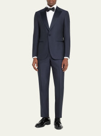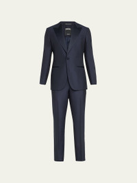 ZEGNA solid sartorial tuxedo Peak lapels; single-button front Chest welt pocket Jetted side pockets Unfinished sleeves Double-vented back Flat-front trousers Modern fit Wool Made in Italy Model is 6'1"/185cm. Online Inquiries: BGS21_NAFTK| Store Inquiries: #4452190
