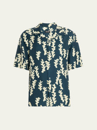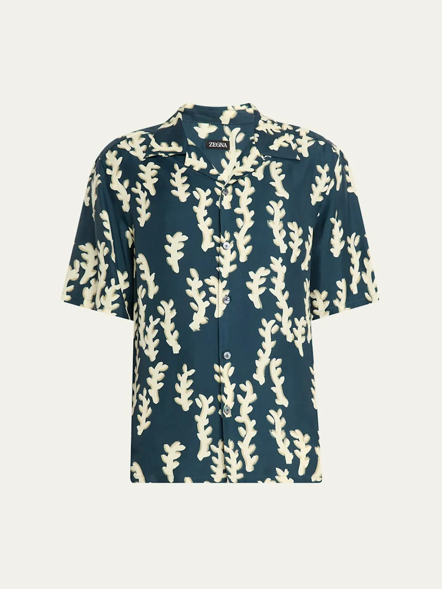 ZEGNA camp shirt in lustrous silk showcasing the signature Oasi print Cuban collar Button front Short sleeves Vented sides Straight hem Silk Dry clean Made in Italy Online Inquiries: BGS21_NCXGY| Store Inquiries: #4971399