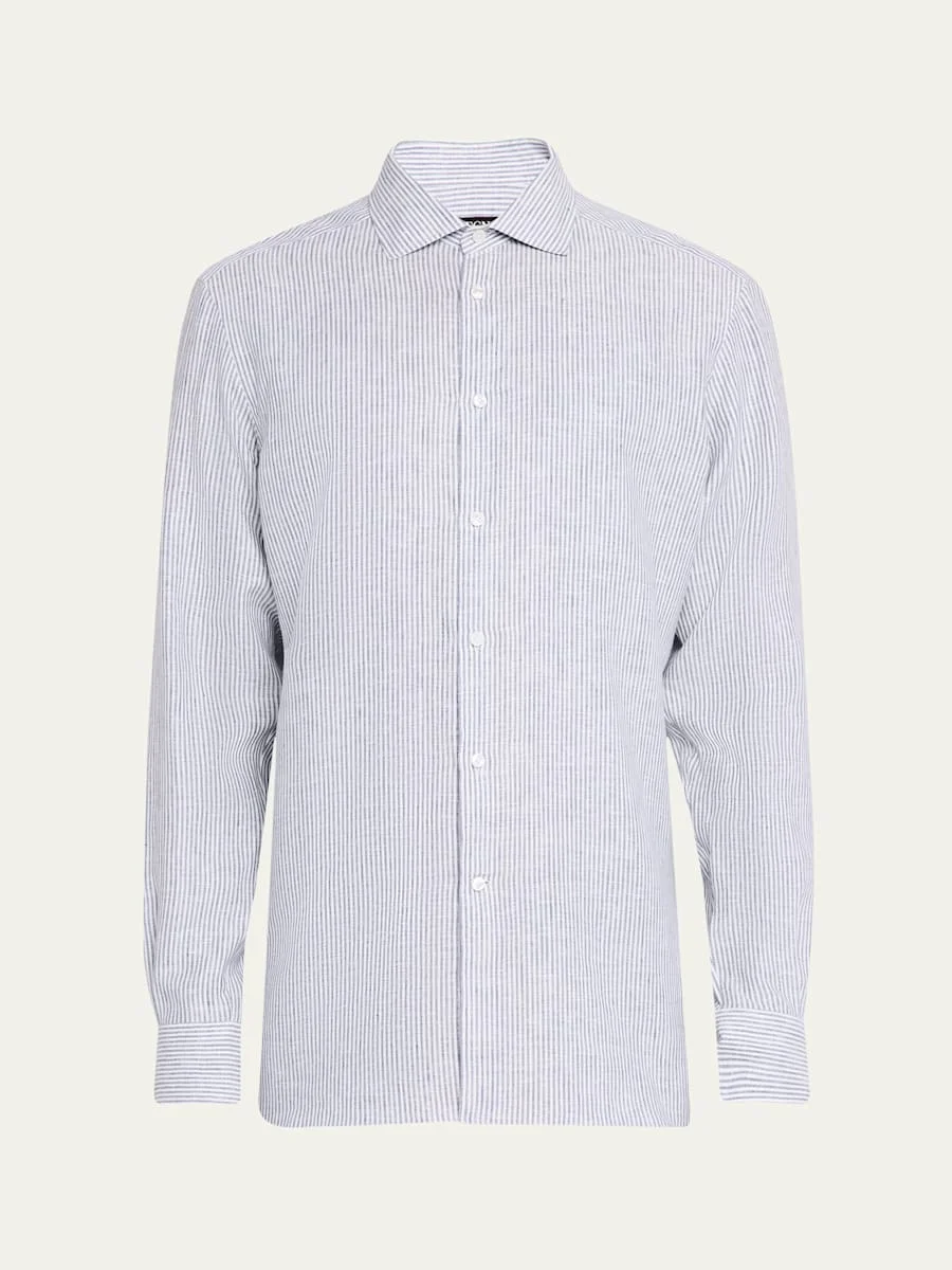 ZEGNA casual button-down shirt in Oasi Lino linen with a pinstripe print Oasi Lino linen is crafted exclusively from European-grown flax fibers Point collar Button placket Long sleeves Round barrel cuffs Back yoke Shirttail hem Linen Made in Italy Proposition 65 warning for California residents Online Inquiries: BGS21_NCPKB| Store Inquiries: #4924470
