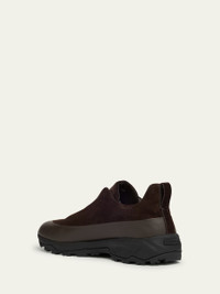 ZEGNA sneakers in supple suede with a leather mudguard showcasing the signature triple-crossed elastics to ensure an easy slip-on fit Triple Stitch™ collection Flat chunky heel Reinforced round toe Triple Stitch™ vamp Debossed tongue logo Padded collar Leather lining Sanitized® removable footbed Backstay pull tab Zegna 232 Road Brand Mark on the heel Vibram® Arctic Grip All Terrain advanced grip sole Slip-on style Made in Italy Online Inquiries: BGS21_NDQH1| Store Inquiries: #5066836