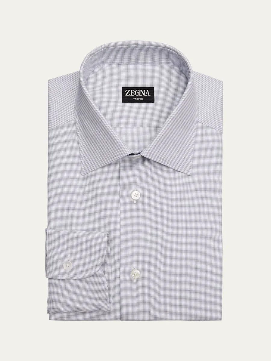 ZEGNA dress shirt in Trofeo™ cotton displaying a nano check print Trofeo is made from fine, long fibers for a silky smooth finish and added wrinkle-resistance Point collar Button placket Long sleeves Round barrel cuffs Cotton Dry clean Imported Online Inquiries: BGS21_NDNSZ| Store Inquiries: #5056043