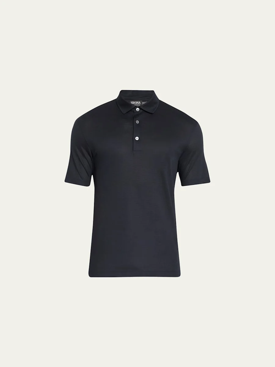 ZEGNA solid polo shirt with the signature Signifier stripe tab Spread collar; three-button placket Short sleeves Even vented sides Pullover style Wool Imported Model is 6'1"/185cm. Online Inquiries: BGS21_NARWS| Store Inquiries: #4508042