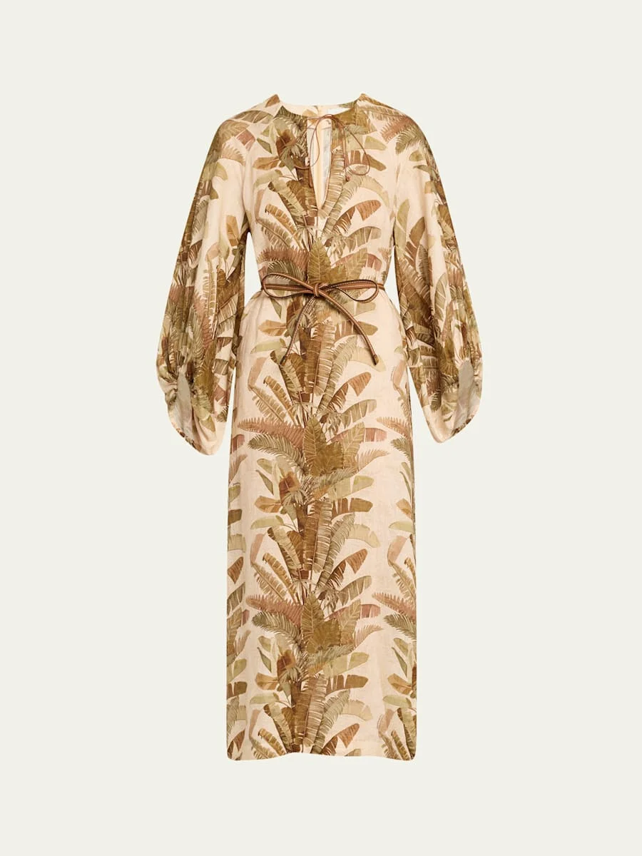Zimmermann "Ascension" dress designed with an allover palm leaf print V neckline with calfskin leather self-ties Long balloon sleeves; elastic cuffs Self-tie belt Hem falls below the knee A-line silhouette Invisible back zipper Linen/cotton/leather Made in Portugal Size conversion: 0 = X-Small, 1 = Small, 2 = Medium, 3 = Large Online Inquiries: BGS21_T6LPJ| Store Inquiries: #5007051