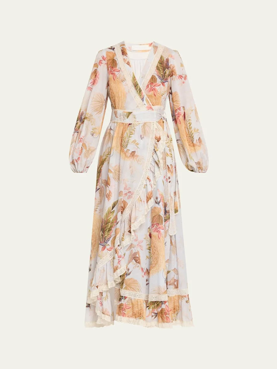 Featuring a tropical-inspired floral print, the "Ascension" dress by Zimmermann is finished with delicate lace trim that exudes femininity. V neckline Long voluminous sleeves with elastic cuffs Wrap silhouette Hem falls below the knee Side tie closure Cotton Dry clean Made in Portugal Size conversion: 0 = X-Small, 1 = Small, 2 = Medium, 3 = Large Online Inquiries: BGS21_T6LRT| Store Inquiries: #5008826