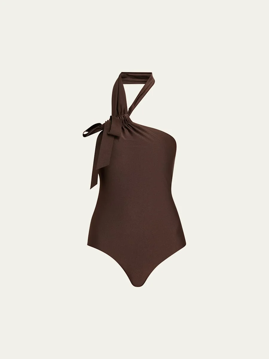Zimmermann's "Awaken" onepiece swimsuit features a shiny finish and an adjustable knot strap with bowtie detailing at the shoulder Asymmetric halter neckline Full seat coverage Nylon/polyamide/elastane Imported