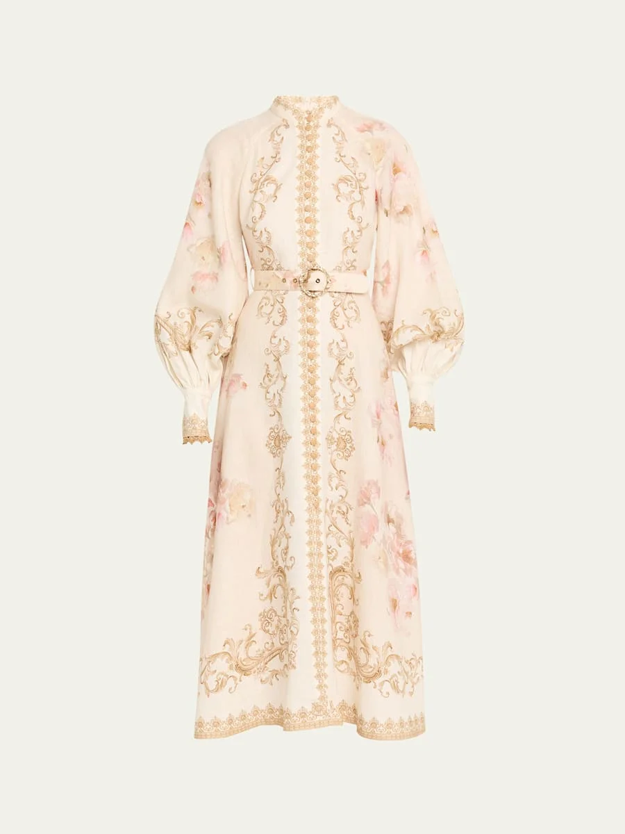 Zimmermann linen midi dress decorated in an intricate floral-scroll print High neckline; button-front Long raglan sleeves with button cuffs Belted waist Shirtdress silhouette Hem falls below the knee Linen Unlined Dry clean Imported Size conversion: 0 = X-Small, 1 = Small, 2 = Medium, 3 = Large Online Inquiries: BGS21_T6YV3| Store Inquiries: #5048030