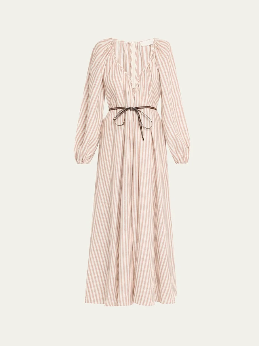 Zimmermann "Cascadian" striped maxi dress adorned with a self-tie calfskin leather belt Notched V neckline Long blouson sleeves; elastic cuffs Full length A-line silhouette Slipover style Linen Imported Size conversion: 0 = X-Small, 1 = Small, 2 = Medium, 3 = Large Online Inquiries: BGS21_T6LPN| Store Inquiries: #5007055