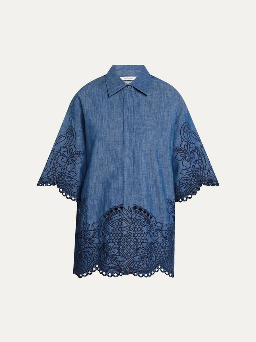 Zimmermann "Coco" denim shirt finished with embroidery Point collar Dropped shoulders Short sleeves Relaxed, oversized fit Hem falls to the hip Concealed button-front Cotton/polyester Unlined Imported Size conversion: 0 = X-Small, 1 = Small, 2 = Medium, 3 = Large Online Inquiries: BGS21_T6LR5| Store Inquiries: #5008804