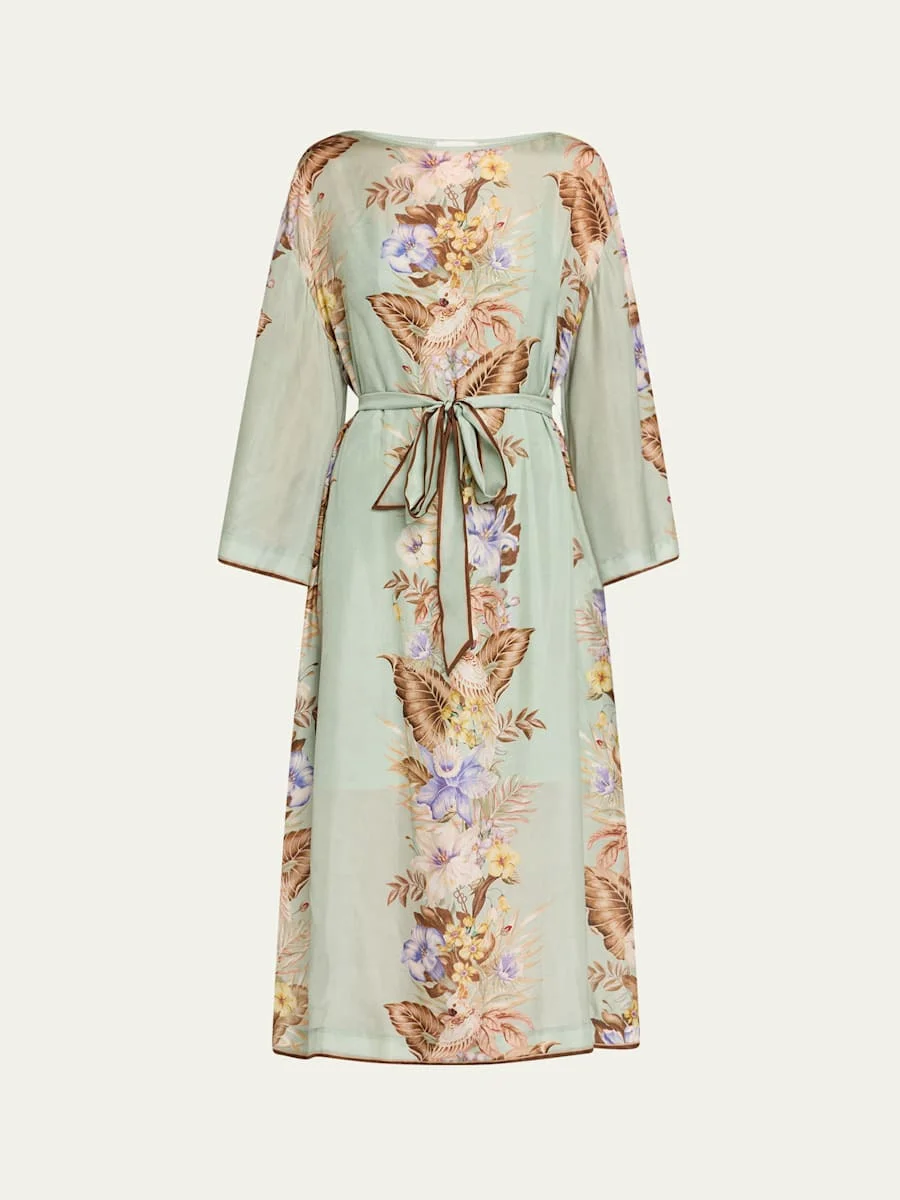 Zimmermann tunic-style dress in a multi floral print Boat neckline Relaxed long sleeves Self-tie belt Hem falls below the knee A-line silhouette Slipover style Silk/polyester Imported Size conversion: 0 = X-Small, 1 = Small, 2 = Medium, 3 = Large Online Inquiries: BGS21_T6LP9| Store Inquiries: #5007041