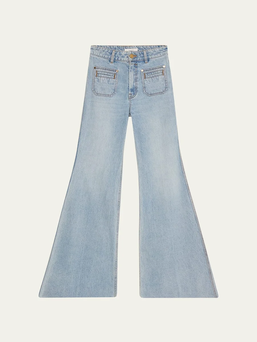 Zimmermann flared jeans crafted from cotton denim High rise Faux front pockets; back welt pockets Relaxed fit Full length Button/zip fly; belt loops Cotton/elastane Dry clean Imported