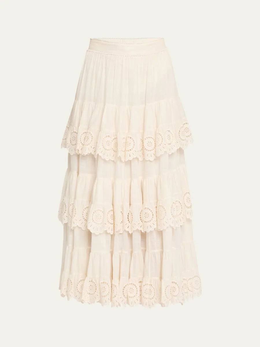 Zimmermann "Lucky" embroidered midi skirt finished with a tiered hem High rise A-line silhouette Hem falls below the knee Center back zip Cotton/polyester Lining: Cotton Dry clean Imported Size conversion: 0 = X-Small, 1 = Small, 2 = Medium, 3 = Large Online Inquiries: BGS21_T6LQQ| Store Inquiries: #5008789