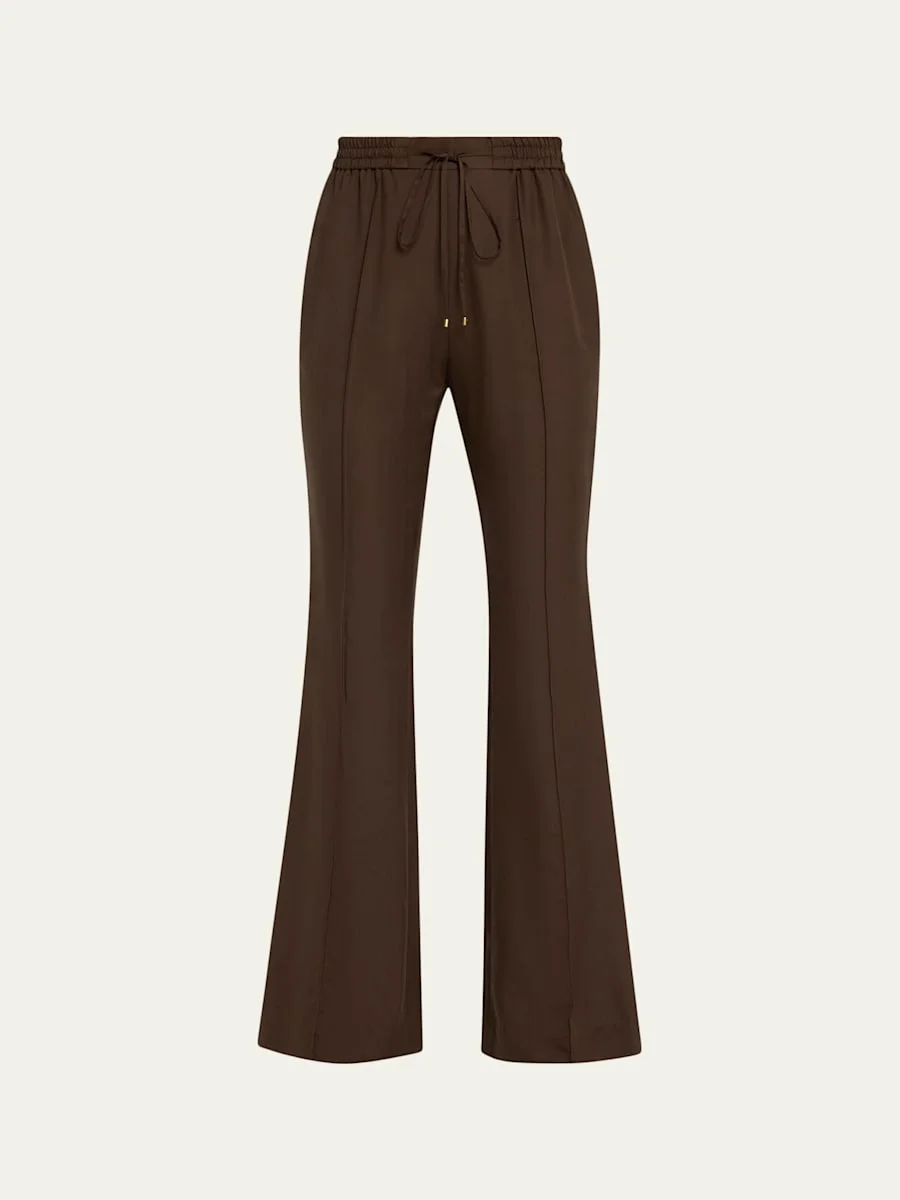 Crafted from luxurious silk, the "Luna" track pants by Zimmermann elevate a casual silhouette with a pintuck front that elongates the leg. Midrise; sits high on the hip Drawstring waistband Side seam pockets Loose, flared legs Full length Pullon style Silk Dry clean Imported