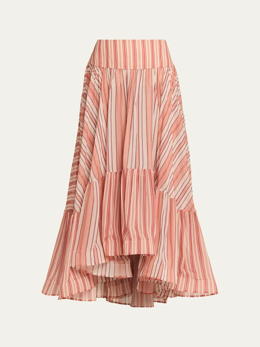 Finished with a voluminous gathered hem, the "Rebellion" midi skirt by Zimmerman boasts a multistripe motif, creating a fluid silhouette that moves effortlessly with every step. High rise Wide waistband Aline silhouette Highlow hem Center back zip Viscose Lining: Cotton Dry clean Imported Size conversion: 0 = XSmall, 1 = Small, 2 = Medium, 3 = Large SIZE amp; FITModel measurements: 5'10" tall Model is wearing a US size 4/Small