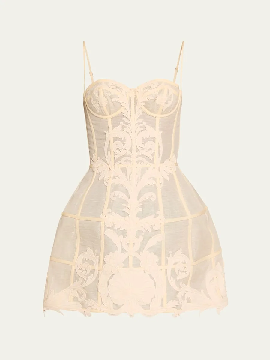 Adorned with allover lace embroidery, the "Rebellion" mini dress by Zimmermann is crafted from a silklinen blend and features a birdcagestyle skirt with internal boning. Includes a detachable lace collar Sweetheart neckline Adjustable straps Aline silhouette Hem falls above the knee Center back zip Linen/silk Dry clean Imported