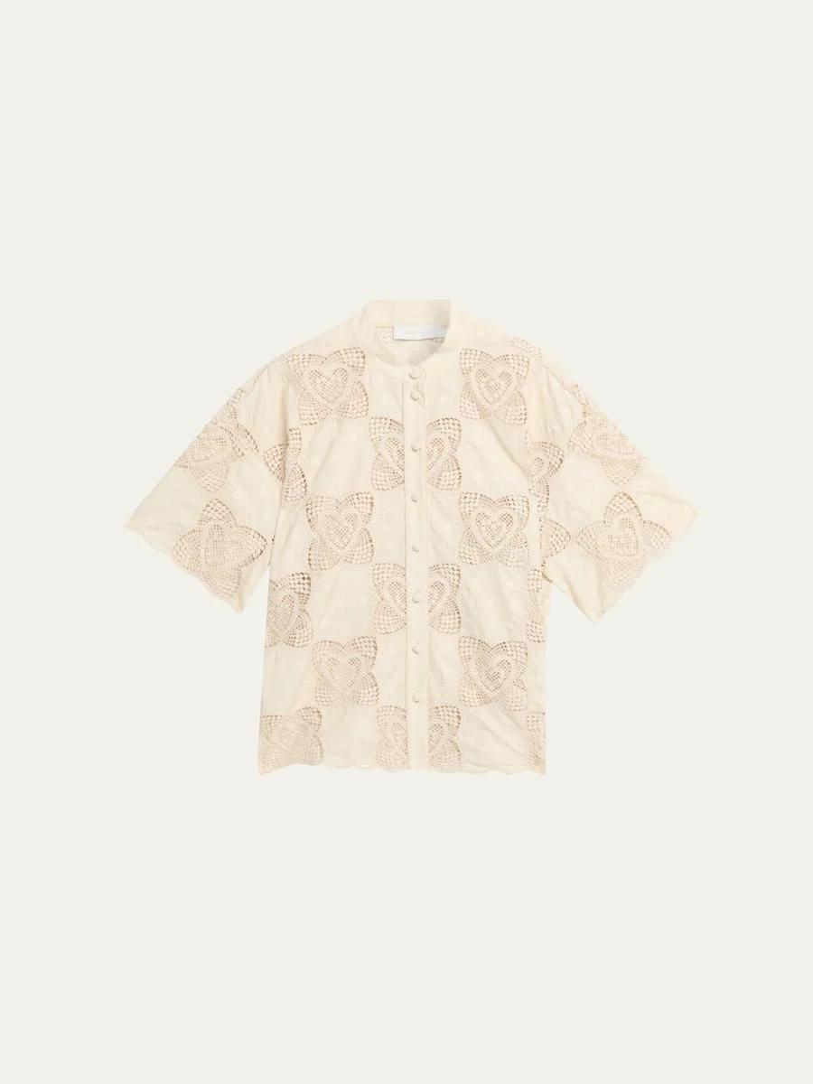 Cut from an airy cotton blend, Zimmermann's "Wanderlust" is embroidered with dainty hearts and paneled crochet squares for a checkerboard effect Band collar Elbowlength sleeves Relaxed fit Hip length Button front closure Cotton Imported