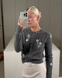 Meet Cardigan Gilberte. Hand-embroidered with shimmering crystals and pearls, this knit transforms soft grey into something luminous. Cut in a short, cosy fit and finished with matching fabric-covered buttons, it layers effortlessly and pairs with Skirt Eva for a true BERNADETTE silhouette. Product information Charlotte is 168cm / 5'6" and wears size XS. Cardigan Gilberte fits true to size. Take your usual size. For size inquiries, e-mail sales@bernadetteantwerp.com. Made in Romania 90% SUPERFINE WO 10% WS