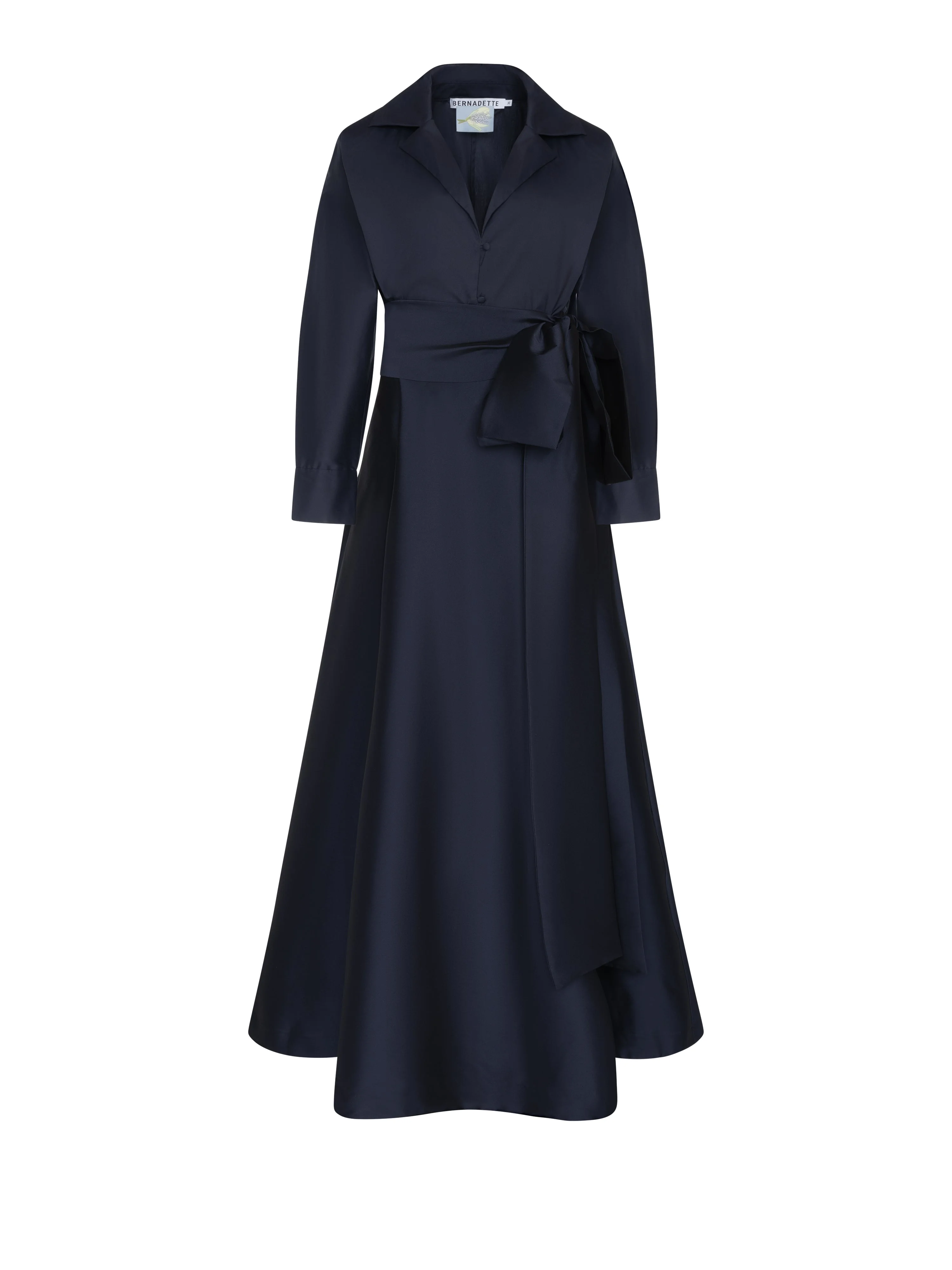 Introducing the Dress Beatrice in navy—a maxi dress with a flowing silhouette. Featuring a removable waist-cinching belt, fabric-covered buttons, and a side slit, it elegantly blends a soft cotton top with a taffeta skirt. Product information Charlotte is 168cm / 5'6" and wears size EU34. Dress Beatrice fits true to size. For size inquiries, e-mail sales@bernadetteantwerp.com Fabrics from Italy Made in Romania Blouse: 74% Organic CO 21% PA 5% EA£ Skirt: 78% PL 20% PA 2% EA