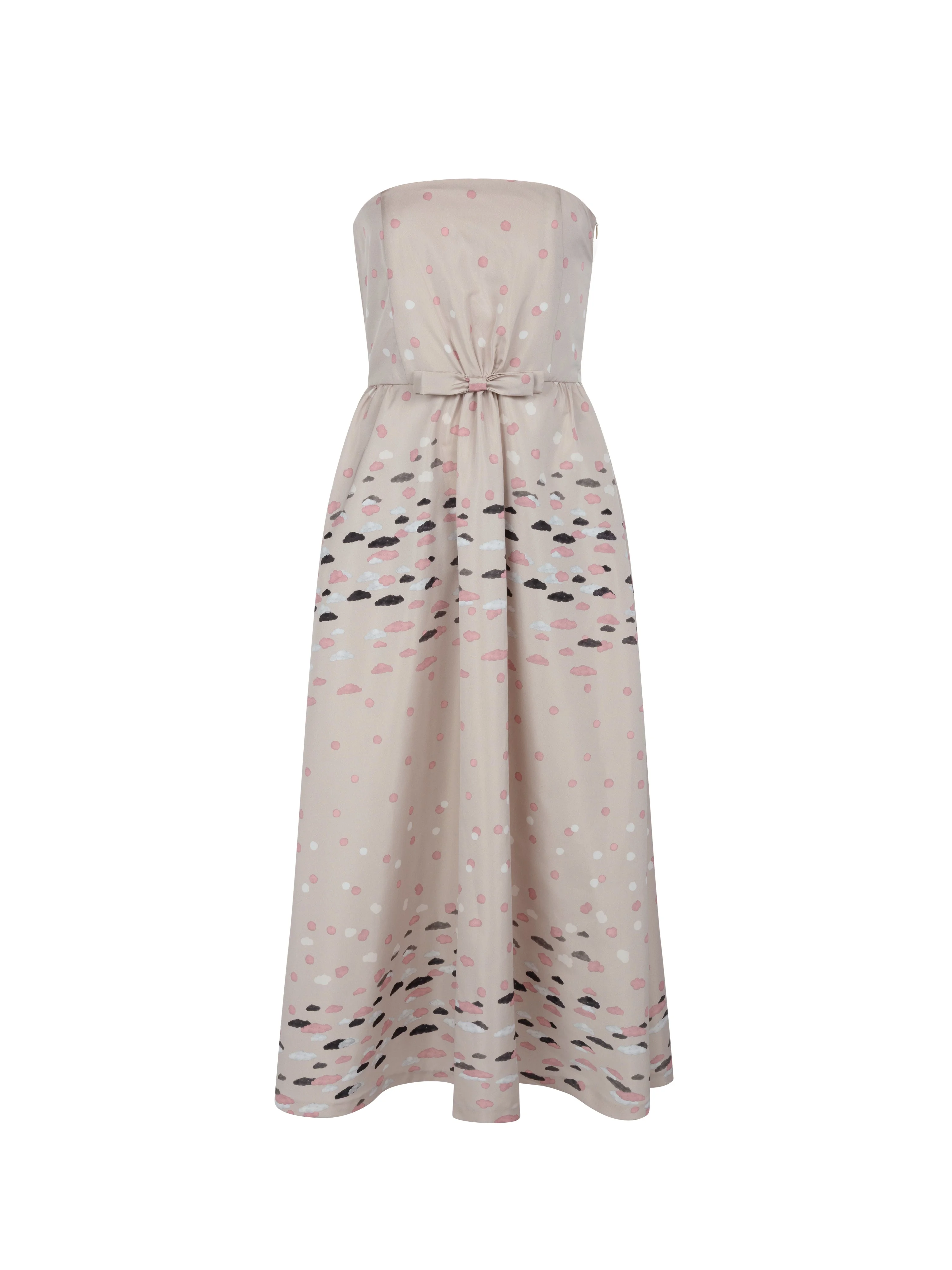 Dress Bodette is crafted in our Polka Clouds – Blush, Ivory & Black on Sand print. Cut in a structured bustier shape with a bow cinching the waist. Flowing into a graceful midi silhouette, it balances playful detail with clean lines, making it a perfect piece from day through evening. Product information Puck is 174 cm / 5’8” and wears size EU34. Tumbush is 173 cm / 5’8” and wears size EU36. Dress Bodette fits true to size. Take your usual size. For size inquiries, e-mail sales@bernadetteantwerp.com. Fabrics from Italy Made in Romania 100% PL