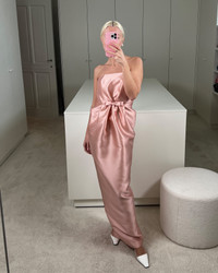 Dress Lenette is imagined in a warm pink hue, cut in a structured bustier and finished with a bow accentuating the waist. Flowing into an elegant maxi silhouette that tapers at the hem, it turns playful detailing into a refined gown—perfect for statement evenings. Product information Charlotte is 168cm / 5'6" and wears size EU34. Tumbush is 173 cm / 5’8” and wears size EU36. Dress Lenette fits true to size. Take your usual size. For size inquiries, e-mail sales@bernadetteantwerp.com. Fabrics from Italy Made in Romania 85% PL 15% SE