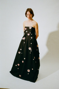 Dress March is a stunning bustier floor-length dress hand-embroidered with delicate camellia flowers in soft blush pink. Its graceful silhouette is elevated by a large bow at the back, making it a true showstopper. Product information Charlotte is 168cm / 5'6" and wears size EU34. Romy is 178 cm / 5'10" and wears size EU36. Dress March is fully lined and fits true to size. For size inquiries, e-mail sales@bernadetteantwerp.com. Fabrics from Italy Made and hand-embroidered in India 78% PL 20% PA 2% EA