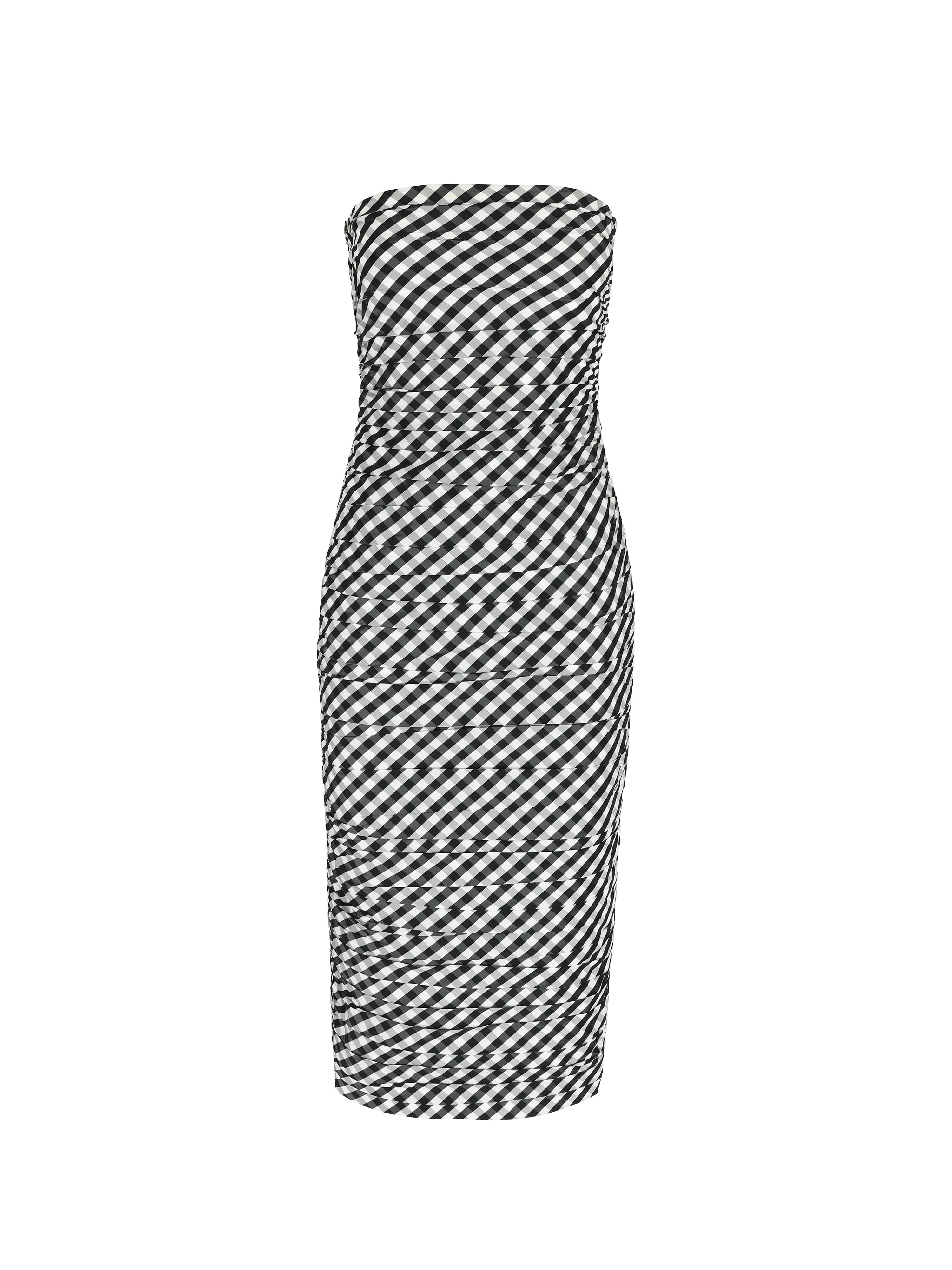 Dress Tia is a strapless, midi dress with a BERNADETTE twist. The Tia dress is suitable for many occasions, featuring a craftfully pleated black gingham. This mid-length dress is cut from a light and crisp taffeta fabric. Tia has a way of locking eyes, making this the perfect showstopper this summer. Product information Charlotte is 168 cm / 5'6" and wears size EU34. Tes is 174 cm / 5'8" and wears size EU36. Designed for a slim fit. Dress Tia fits true to size, however if you are in between sizes, we recommend taking a size up. For size inquiries, e-mail sales@bernadetteantwerp.com. Fabrics from Italy Made in Romania 78% PL 20% PA 2% EA