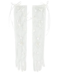 For our 2025 bridal collection we're introducing our gloves with hand-embroidered pearls. The tulle fabric covers your arms elegantly, finished with a knotted little bow above the elbow to ensure elegance at all times. Embrace glamour with these hand-embroidered pearl gloves and the matching hand-embroidered veil. Product information Gloves with hand-embroidered pearls. The gloves fit one size. For inquiries, e-mail sales@bernadetteantwerp.com. Hand-embroidered in India. 100% NY