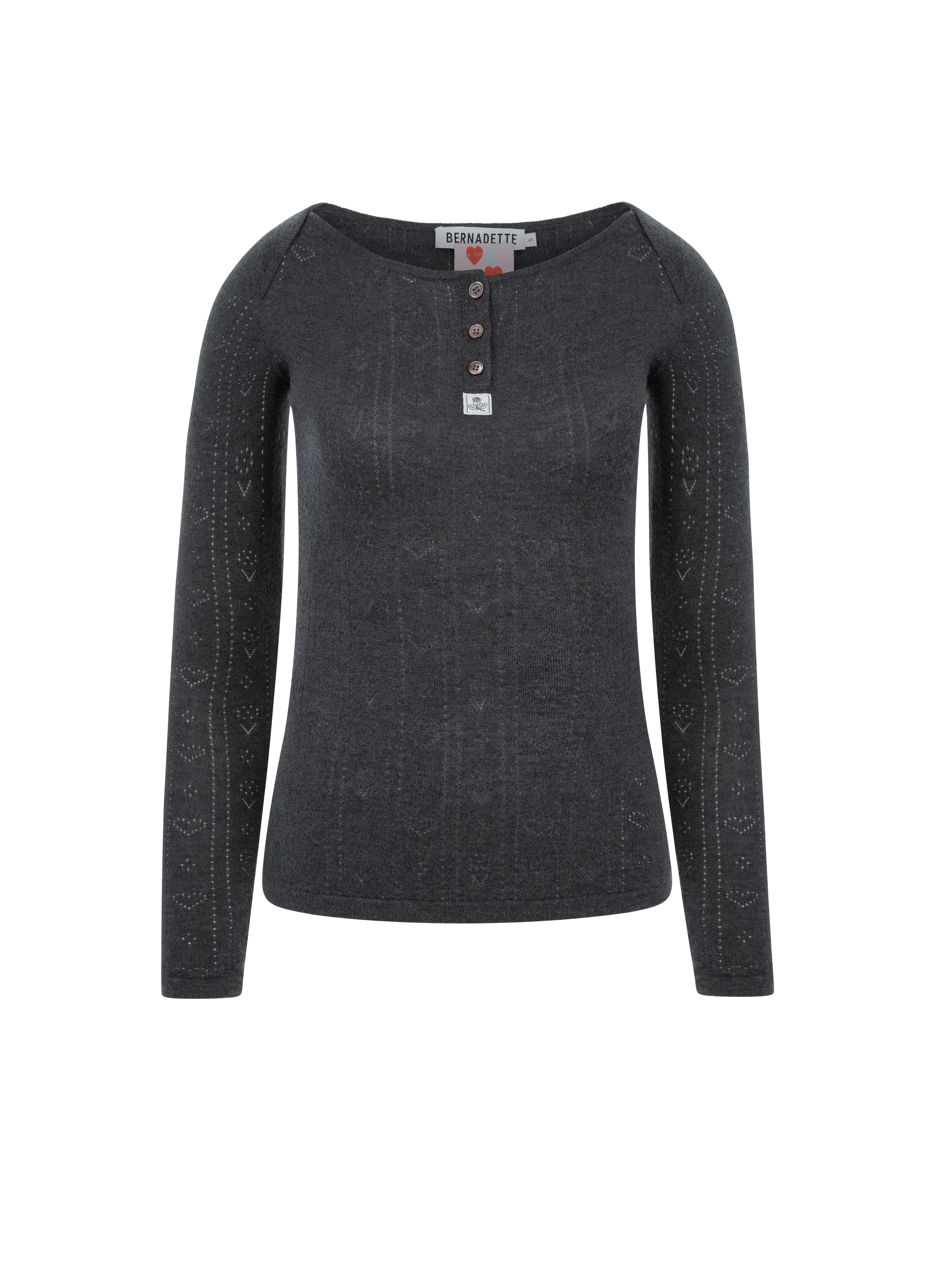 Henley Hunter is the knit to carry you through the season. In our Grey melange silk cashmere pointelle, the classic Henley shape gets a playful twist — delicate buttons, soft knit detailing, and a subtle heart-dotted motif woven through the polka. Style it with Skirt Eva in ivory or pair with Skirt Taylor in the matching color. Product information Charlotte is 168 cm / 5'6" and wears size XS. Aster is 176 cm / 5’9” and wears size XS. Top Henley fits true to size. For size inquiries, e-mail sales@bernadetteantwerp.com. Made in Belgium 70% SE 20% WO 10% WS