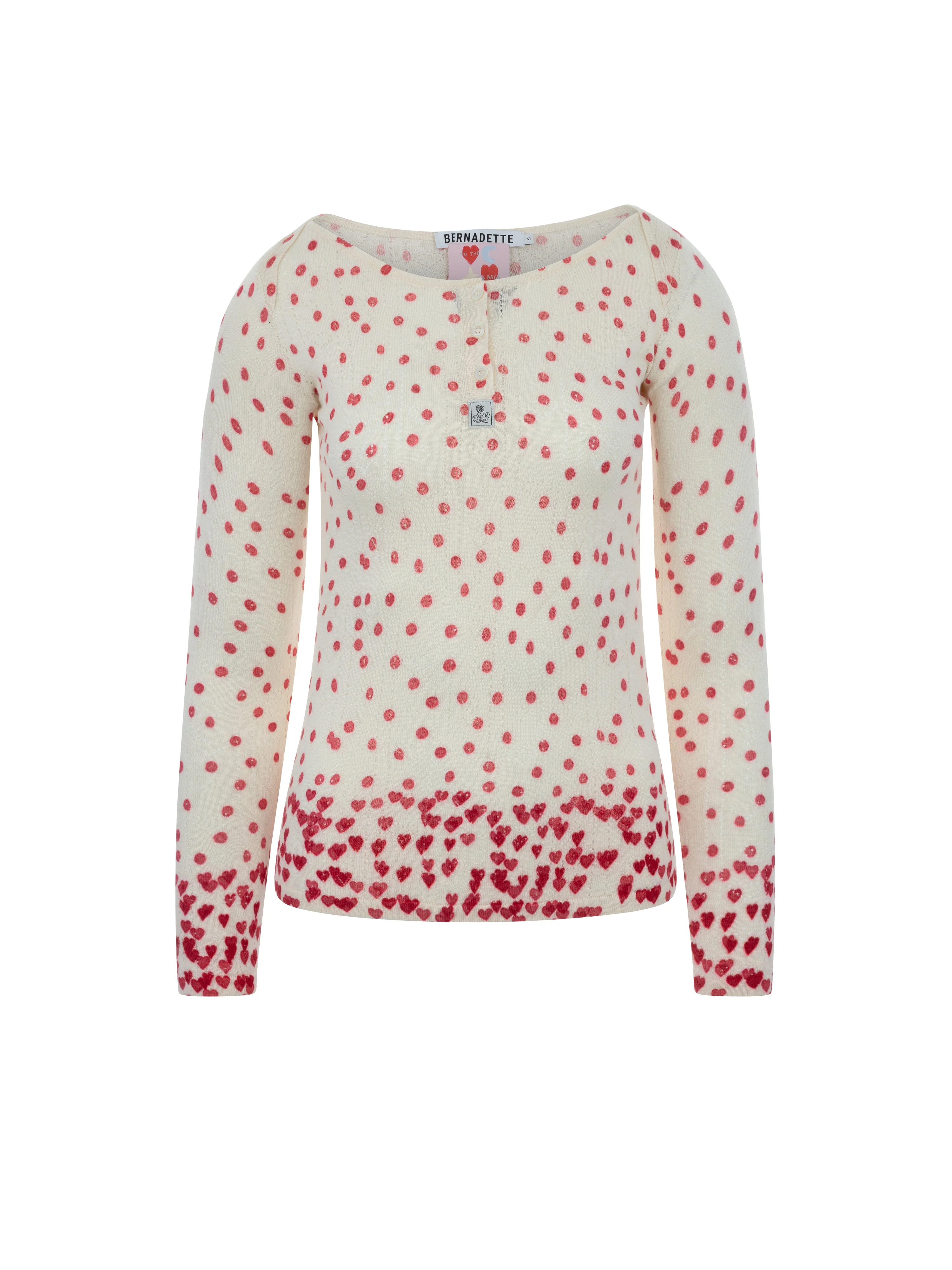Henley Hunter is the knit to carry you through the season. In our Red on Vanilla Polka to Heart silk cashmere pointelle, the classic Henley shape gets a playful twist — delicate buttons, soft knit detailing, and a subtle heart-dotted motif woven through the polka. Style it solo or pair with Skirt Taylor in the matching print. Product information Charlotte is 168 cm / 5'6" and wears size XS. Top Henley fits true to size. For size inquiries, e-mail sales@bernadetteantwerp.com. Made in Belgium 70% SE 20% WO 10% WS