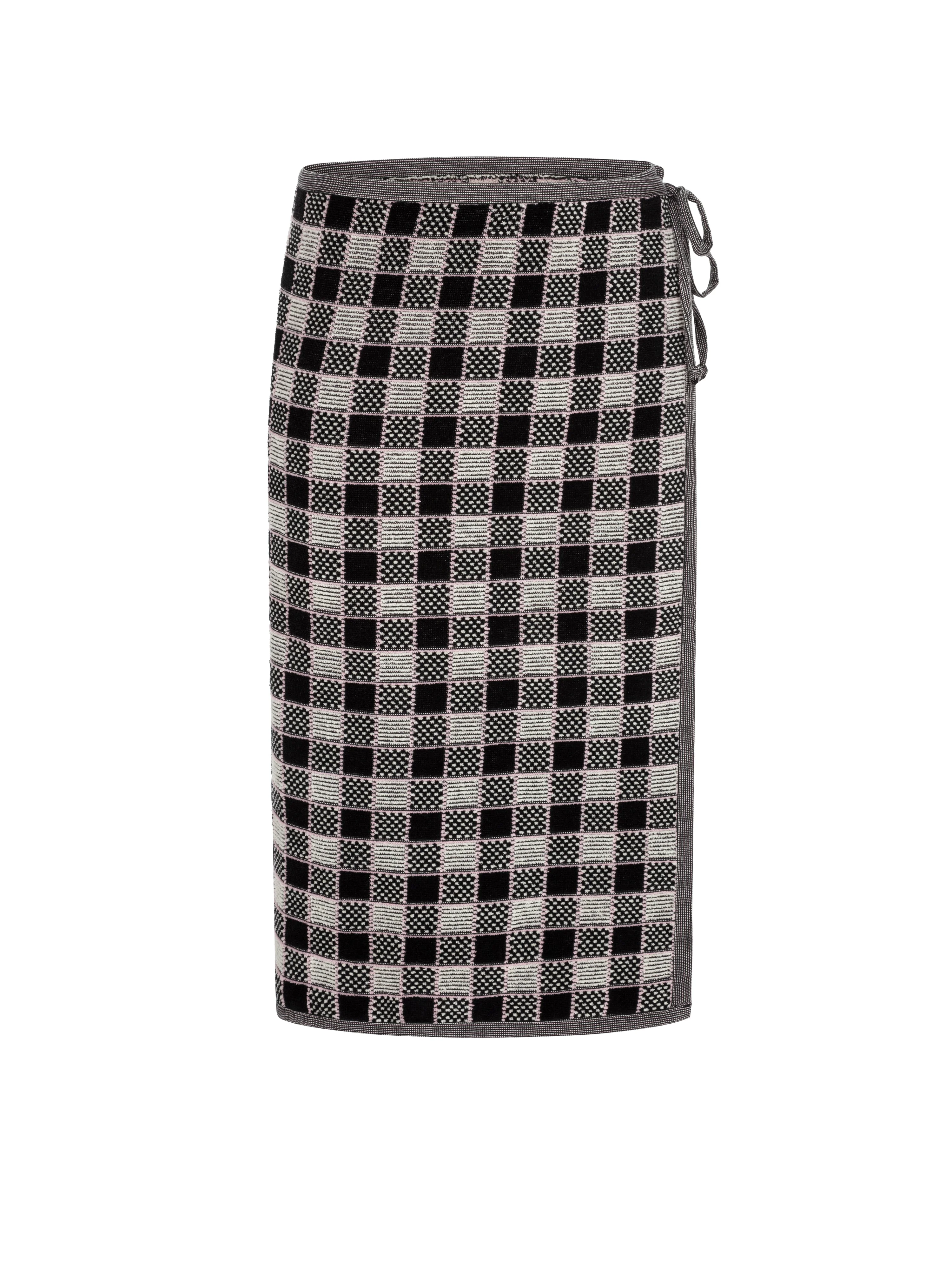 Introducing our long towel skirts — a beach capsule essential. BERNADETTE's black gingham wrap skirt ties at both sides for an easy, adjustable fit. Wear it as a skirt or wrap it as a dress. This beachy must-have is made to shift with you from beach to dinner, barefoot to dressed up. Product information The beach skirts are made in Italy from super soft cotton, providing you with the ultimate comfort you need. Dimensions: Each skirt measures 130 cm x 65 cm / 51.2" x 25.6". While the overall dress dimensions stay the same across sizes, the strap placement along the top edge varies to ensure a flattering and secure fit for each size: XS: 44 cm / 17.3" between strapsS: 42 cm / 16.5" between strapsM: 40 cm / 15.7" between strapsL: 38 cm / 15.0" between straps For size inquiries, e-mail sales@bernadetteantwerp.com. Made in Italy100% CO Care Instructions: machine wash at 30°C (86°F). Wash colors separately to avoid color transfer.