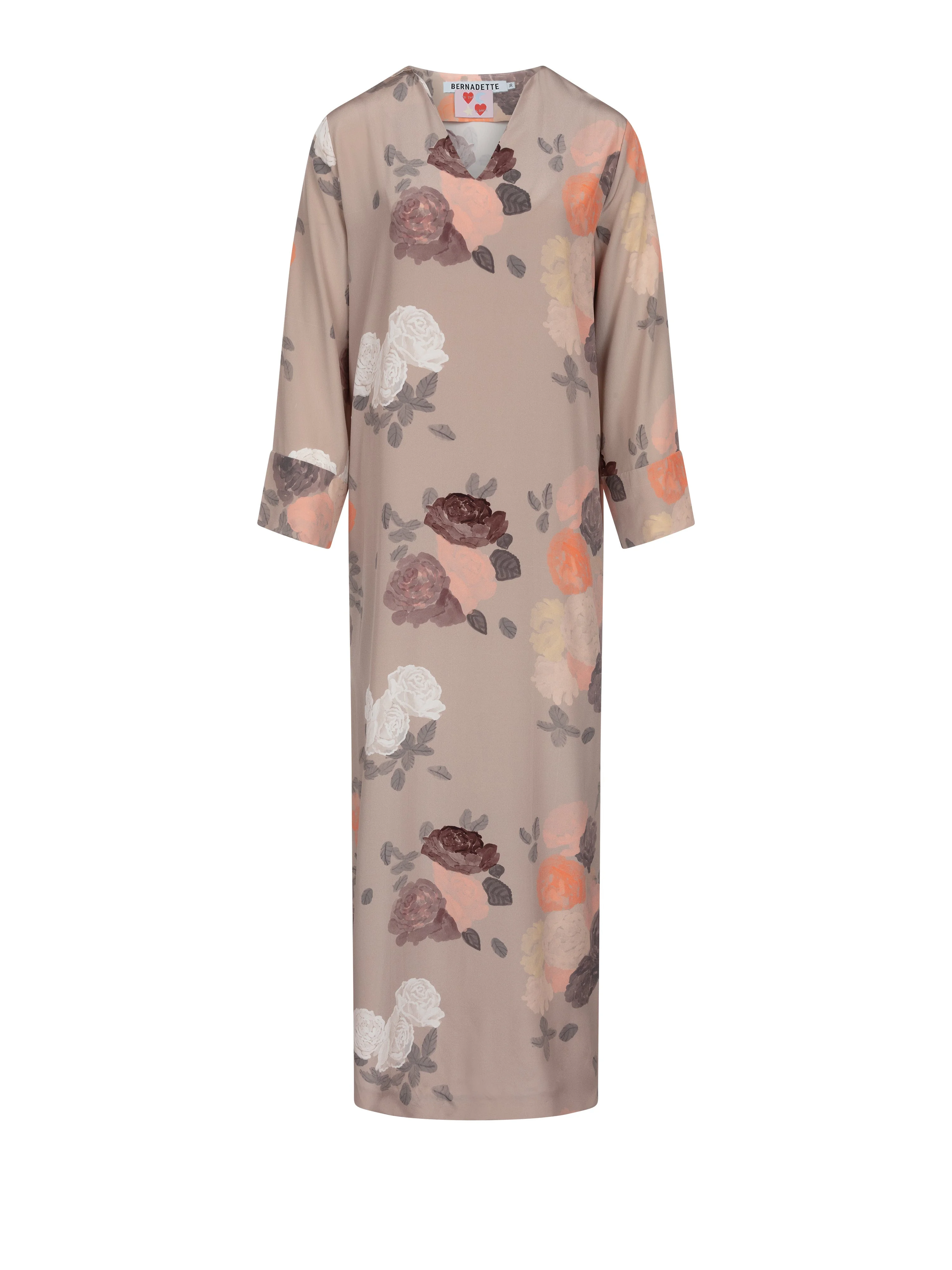 The long kaftan is cut from soft silk and adorned with our hand-painted Auscot Rose motif in peach & chocolate on caramel. A timeless silhouette designed for the cooler months, it layers beautifully over its accompanying slip dress. Product information Mardiana is 174 cm / 5’9” and wears size EU36. Dress Kaftan fits true to size. For sizing information, please e-mail sales@bernadetteantwerp.com. Fabrics from Italy Made in Portugal 100% SE / SLIPDRESS: 100% PL