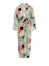 Robes remain a BERNADETTE signature. This silk velvet peignoir is presented in our Auscot Rose print — pink and black florals on sage green. Layer it loose over denim by day or wrap it into a dress by night. Robe moments are never to be missed. Product information Aster is 176 cm / 5’9” and wears size EU34. The robe is fully lined and fits true to size. For size inquiries, e-mail sales@bernadetteantwerp.com. Fabrics from Italy Made in Portugal 82% VI 18% SE / LINING: 100% PL