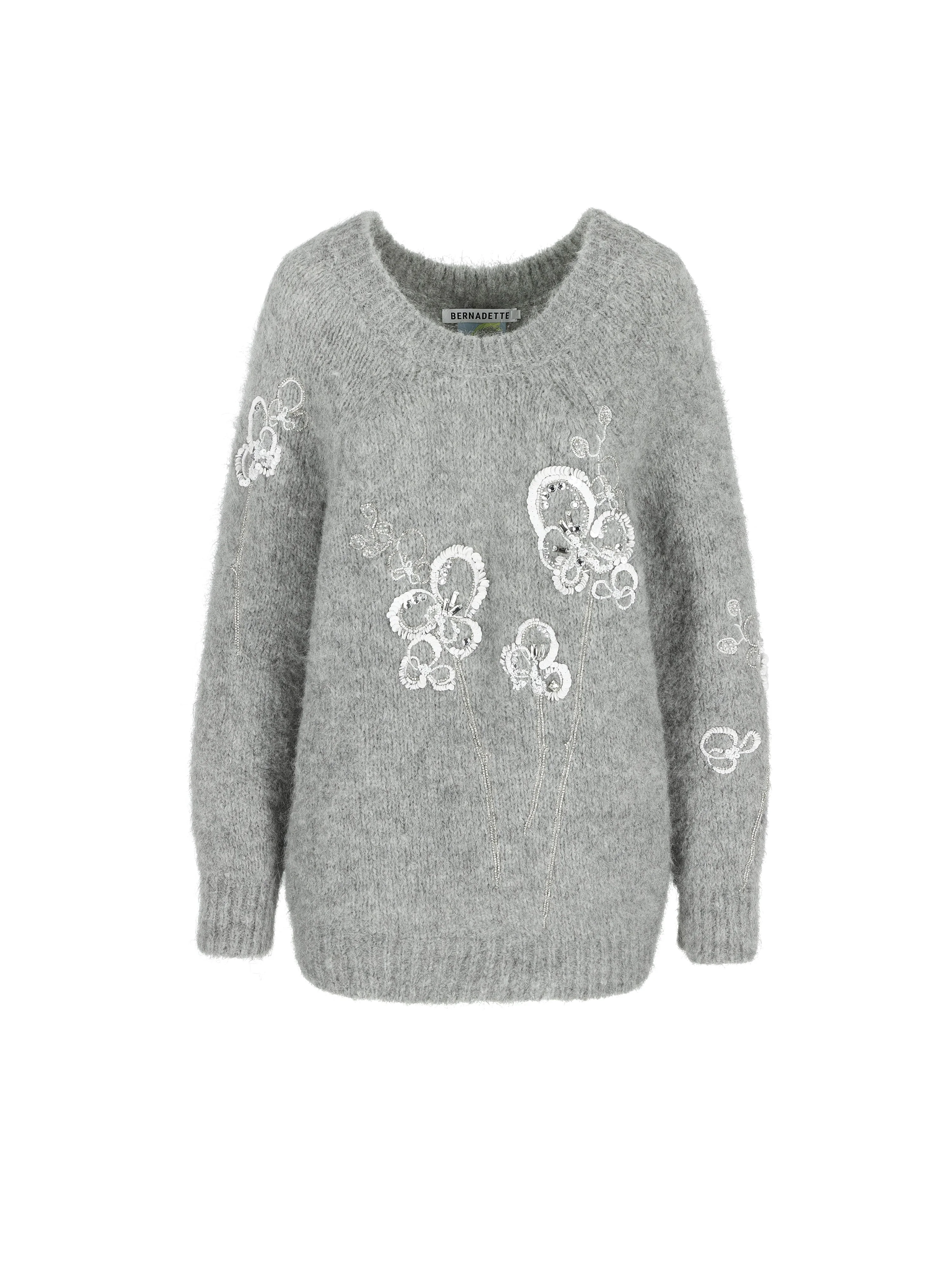 Our Pull Orchidea captures the perfect blend of day and evening wear. This oversized grey melange knit made from the softest Alpaca wool is hand-embroidered with orchid flowers, making it a standout piece for any occasion. Product information Charlotte is 168 cm / 5'6" and wears size XS. Tes is 177 cm / 5'8" and wears size S. Pull Orchidea has an oversized fit, we recommend ordering your regular size. For size inquiries, e-mail sales@bernadetteantwerp.com. Yarns from Italy Made in Bulgaria Hand-embroidered in India 63% SUPERFINE WP 37% PA