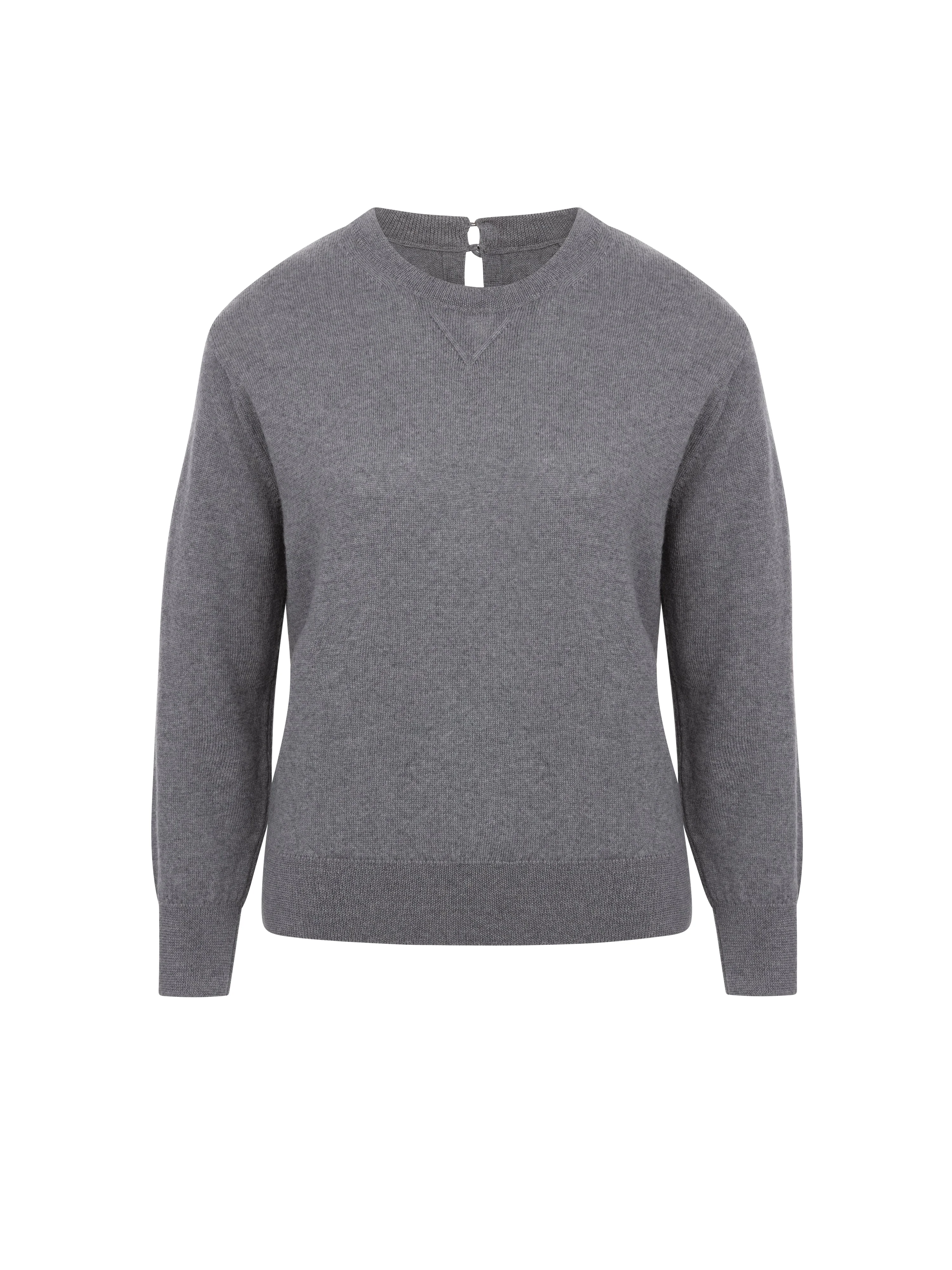 Meet Pull Rhye. Spun in a true grey, this short merino–cashmere blend knit embraces simplicity with its clean silhouette. Two fabric-covered buttons fasten at the back, adding a subtle detail to its pared-back design. The understated shape makes it the perfect companion to pair with printed BERNADETTE pieces, like skirt Rox with pinstripes and crystal embroidery. Product information Charlotte is 168cm / 5'6" and wears size XS. Pull Rhye fits true to size. Take your usual size. For size inquiries, e-mail sales@bernadetteantwerp.com. Yarns from Italy Made in Bulgaria 90% WV 10% WS