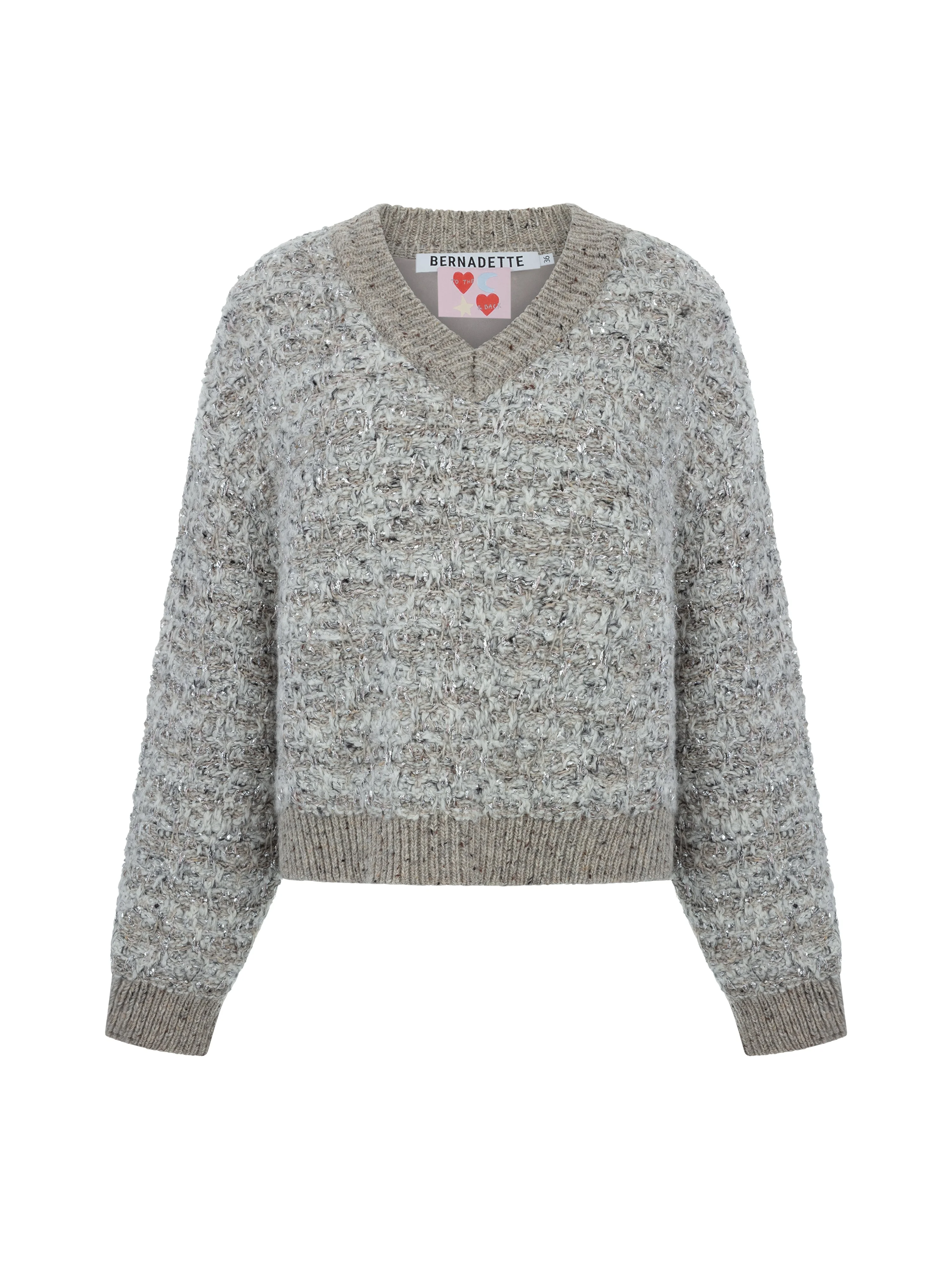 Introducing Pull Tweety, spun in a silver melange tweed. This short V-neck pullover is designed with a chunky knit that gives it an oversized, effortless feel. The metallic thread woven throughout adds a subtle shimmer, making it just as suited for cosy days as for dressed-up evenings. Product information Charlotte is 168cm / 5'6" and wears size XS. Pull Tweety has a short but oversized fit. We recommend ordering your regular size. For size inquiries, e-mail sales@bernadetteantwerp.com. Yarns from Italy Made in Bulgaria 42% WE 15% WP 11% PA 10% Recycled CO 8% PL 8% VI 6% ME