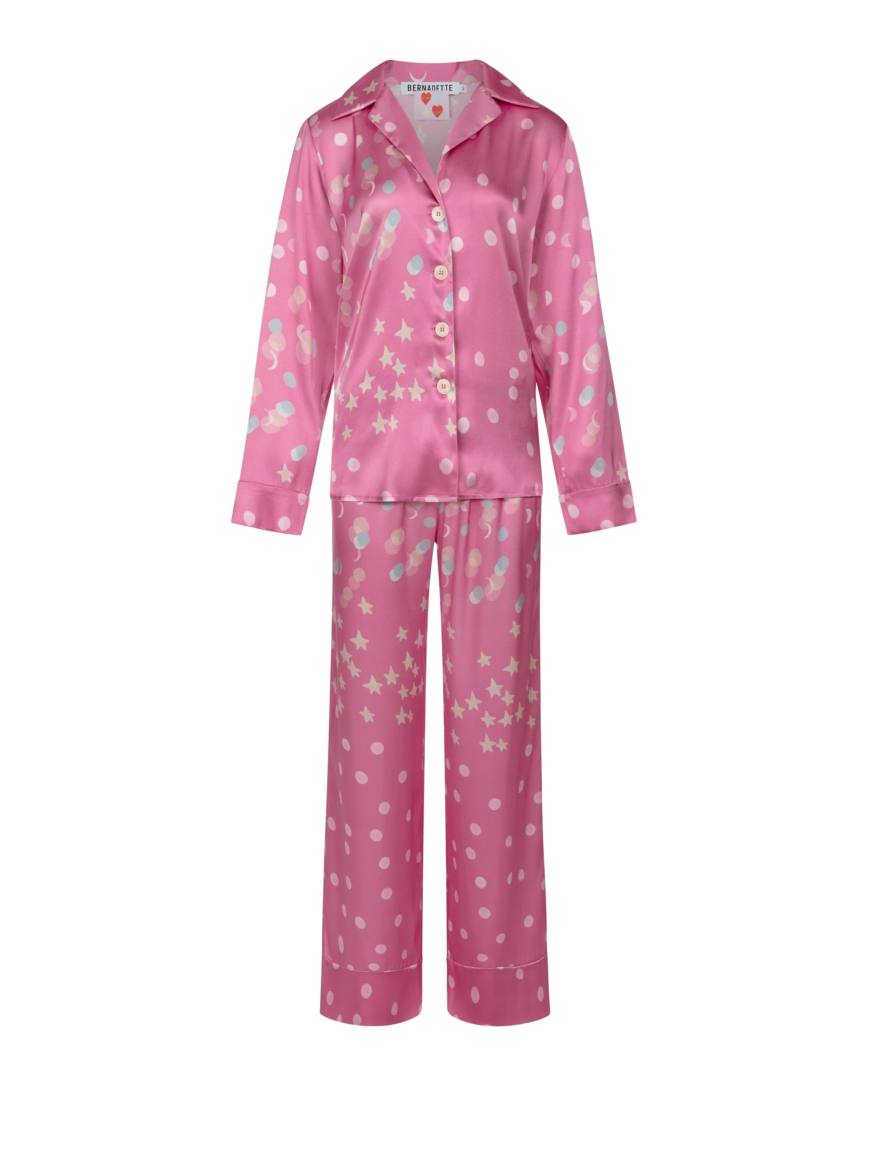 This signature BERNADETTE pyjama is crafted from stretchy silk satin and cut in our oversized fit, made to carry you through every moment of the day. Printed in our playful Polka Sun to Moon on pink, it’s perfect for morning coffee or brunch outings. Product information Zoe is 172 cm / 5'8" and wears size EU36. Pyjama Louis fits true to size, with the shirt having an oversized fit. For size inquiries, e-mail sales@bernadetteantwerp.com. Fabrics form Italy Made in Portugal 92% SE 8% EA