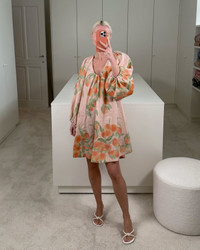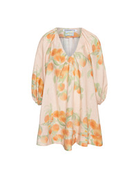 Short dress Georgette is made from light, airy linen. This knee-length dress features a flattering V-neck and puffed-up shoulders, adding volume while balancing the relaxed silhouette. This Summer, it debuts in our new hand-drawn Peach- or Olive tree print. Product information Charlotte is 168 cm / 5'6" and wears size EU34. Short Dress Georgette has an oversized fit. If you don't prefer a deep cleavage, we recommend taking a size down. For size inquiries, e-mail sales@bernadetteantwerp.com. Made in Romania Fabrics from Italy 100% LI Due to the natural qualities of linen, each piece may have subtle variations. These unique characteristics are inherent to printed linen, enhancing the individuality of every garment