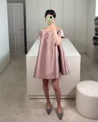 Introducing Dress Will. A short rose silk-blend dress with a playful, voluminous silhouette, brought to life by a statement bow at the back. Designed with a graceful boat neckline, short sleeves, and a sculptural feel, it’s our bold and romantic twist on a modern classic. Product information Charlotte is 168 cm / 5'6" and wears size EU34. Aster is 176 cm / 5’9” and wears size EU34. Tumbush is 173 cm / 5’8” and wears size EU36. Dress Will fits true to size. For size inquiries, e-mail sales@bernadetteantwerp.com Fabrics from Italy Made in Romania 85% PL 15% SE