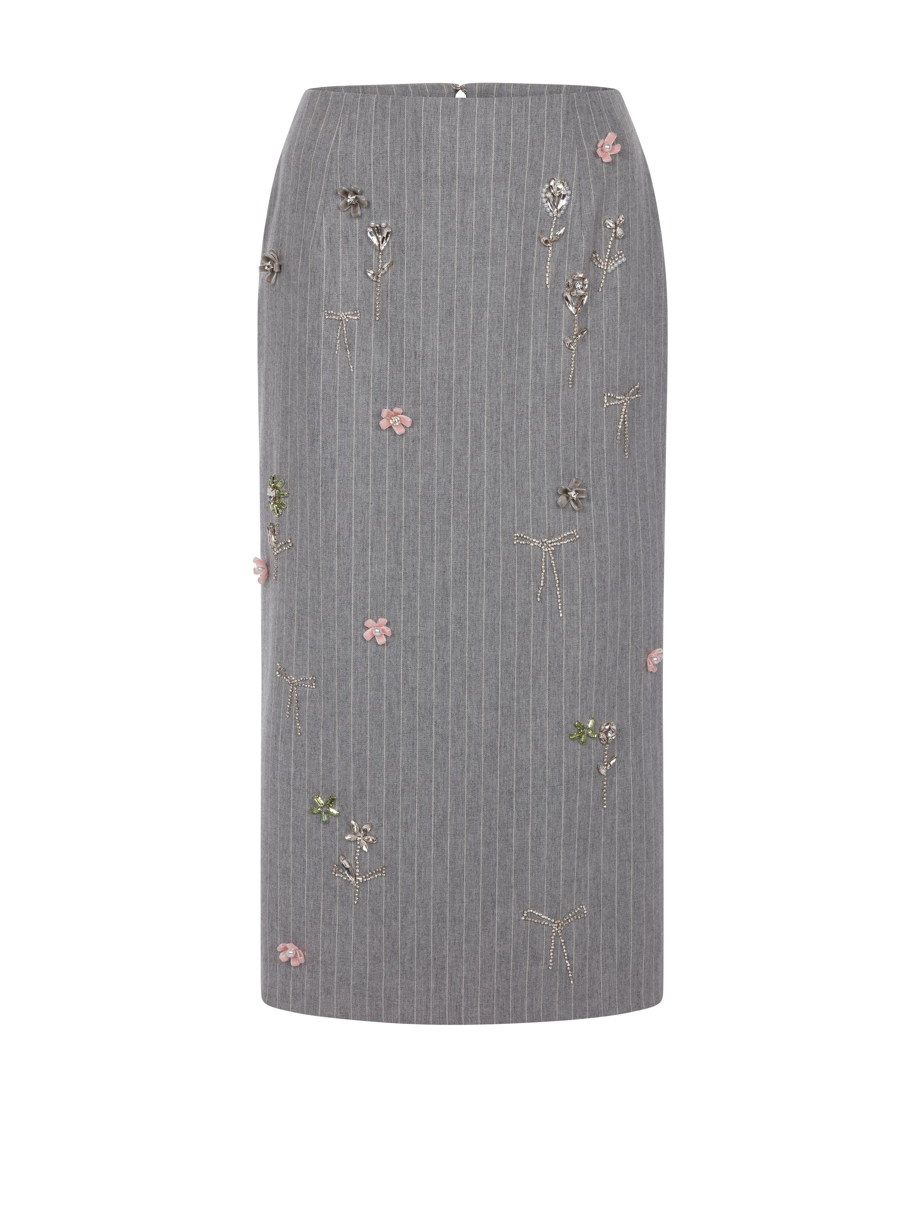 Introducing the Roxane Pinstripe Skirt — a classic midi silhouette reimagined in a wool-blend grey pinstripe, hand-embroidered with fun velvet bows and crystals. A timeless piece made fun the BERNADETTE way. Style it with the Shirt Maxine for an effortlessly chic autumn look. Product information Charlotte is 168cm / 5'6" and wears size EU34. Skirt Rox is fully lined and fits true to size. For size inquiries, please e-mail sales@bernadetteantwerp.com Fabrics from Italy Made and hand-embroidered in India 65% VI 17% PL 14% WO 3% PA 1% EA LINING: 100% VI